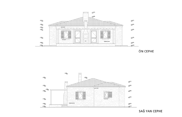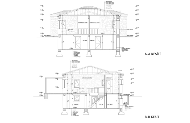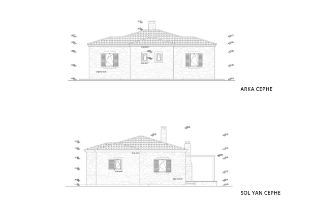 Mimari proje hazırlanırken kullanıcıların ihtiyaçları üzerine ortak bir terasa açılan bina girişleri bulunan simetrik planlı açık salon ve mutfaklı bir planlama yaratılmıştır. Ev taş olarak tasarlanmış, bulunduğu arazinin ön tarafı tamamen üzüm bağı ve meyve ağaçlarına ayrılarak arazinin arka noktasında konumlanmıştır.