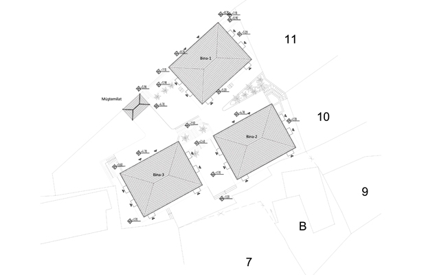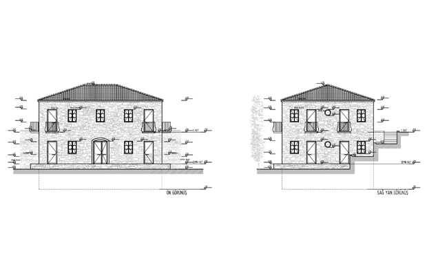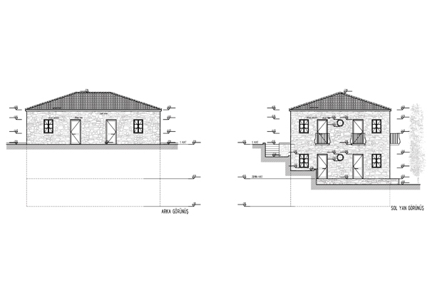 Gökçeada Kaleköy’de yer alan kaleye yakın ve deniz ve köy manzarası bulunan eğimli bir arazide 3 adet tip butik otel projesi tasarlanmıştır. Bu yapılar dikdörtgen planlı ve simetrik düzendedir. Eğimin yapıyla ilişkisi, üst kottan da girilebilen odaların kazanımına yol açmıştır. Her yapıda 8’er yatak odası bulunan blokların tamamı taş kaplamadır.